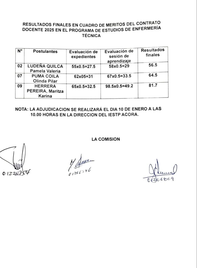 IESTP ACORA > Blog > Comunicados > COMUNICADO: RESULTADOS FINALES EN CUADRO DE MERITOS PARA CONTRATO DOCENTE DE LOS PROGRAMAS DE ESTUDIOS DE ADMINISTRACION DE CENTROS DE COMPUTO Y ENFERMERIA TECNICA RESPECTIVAMENTE
