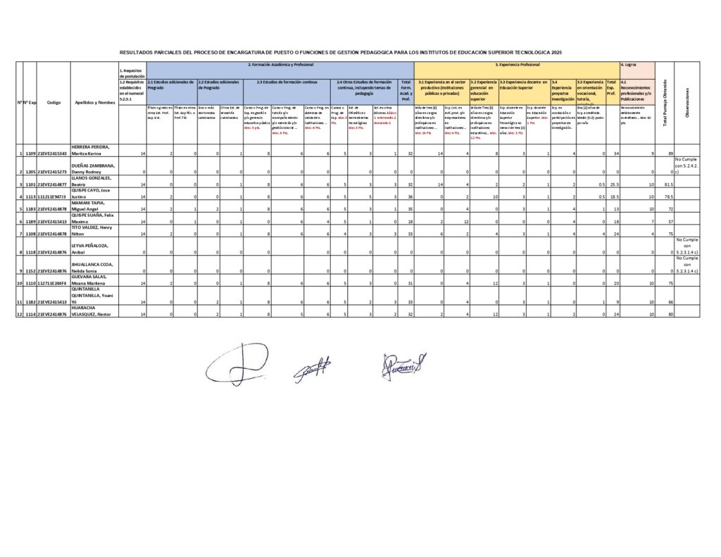 En el documento titulado “RESULTADOS PARCIALES DEL PROCESO DE ENCARGATURA DE PUESTO O FUNCIONES DE GESTIÓN PEDAGÓGICA PARA LOS INSTITUTOS DE EDUCACIÓN SUPERIOR TECNOLÓGICA 2025”
