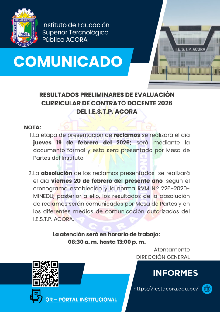 La Dirección del I.E.S.T.P. Acora informa a todos los estudiantes el inicio del Primer Semestre Académico 2026 con horarios establecidos para cada programa. ¡Prepárate para este nuevo comienzo!