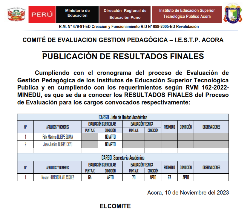 PROCESO DE CONCURSO PARA GESTORES PEDAGOGICOS PARA EL AÑO 2024 DEL IESTP ACORA