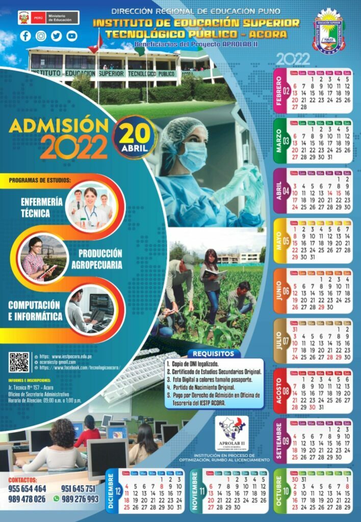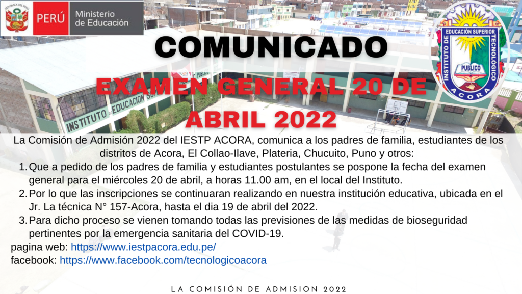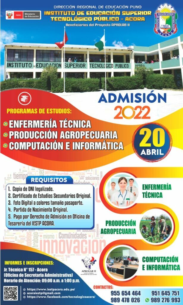 Se comunica a todas las personas interesadas postulantes a los programas de estudios PRODUCCIÓN AGRPECUARIA, ENFERMERIA TECNICA, COMPUTACION E INFORMATICA de nuestra casa superior de estudios I.E.S.T.P ACORA y en concordancia a las normas vigentes y las ORIENTACIONES PARA EL DESARROLLO DEL SERVICIO EDUCATIVO EN EL MARCO DE LA EMERGENCIA SANITARIA (COVID-19) EN LOS CENTROS DE EDUCACIÓN TÉCNICO-PRODUCTIVA E INSTITUTOS Y ESCUELAS DE EDUCACIÓN SUPERIOR “Durante el periodo de estado de emergencia,